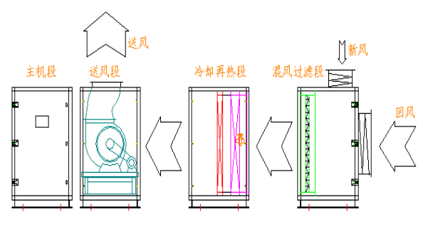 地下工程用除濕空調(diào)機(jī)采用模塊化設(shè)計理念和組合式結(jié)構(gòu),由混風(fēng)過濾段、冷卻再熱段、送風(fēng)段和主機(jī)段組合而成。自由拼裝,連接簡單,拆卸方便。
